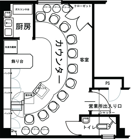 カウンターのみのスタンド形式。スナックやショットバーに最適なお店です。賃料も安く抑えて1人で営業できるお店です。設備完備ですぐに営業可能。 |